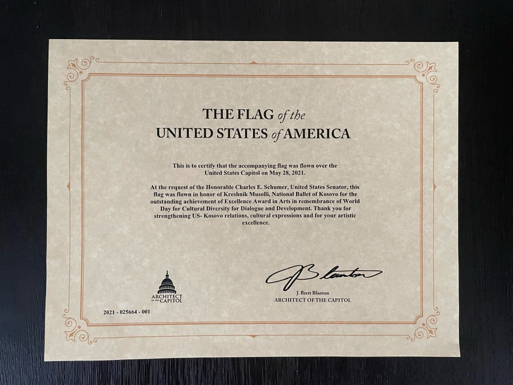“At the request of the honorable Charles E. Schumer, United States Senator, this flag is flown in honor of Kreshnik Musolli, National Ballet of Kosovo in honor of the outstanding achievement of Excellence Award in Arts in remembrance of World Day for Cultural Diversity for Dialogue and Development. Thank you for strengthening US-Kosovo relations, cultural expressions and for your artistic excellence.”
