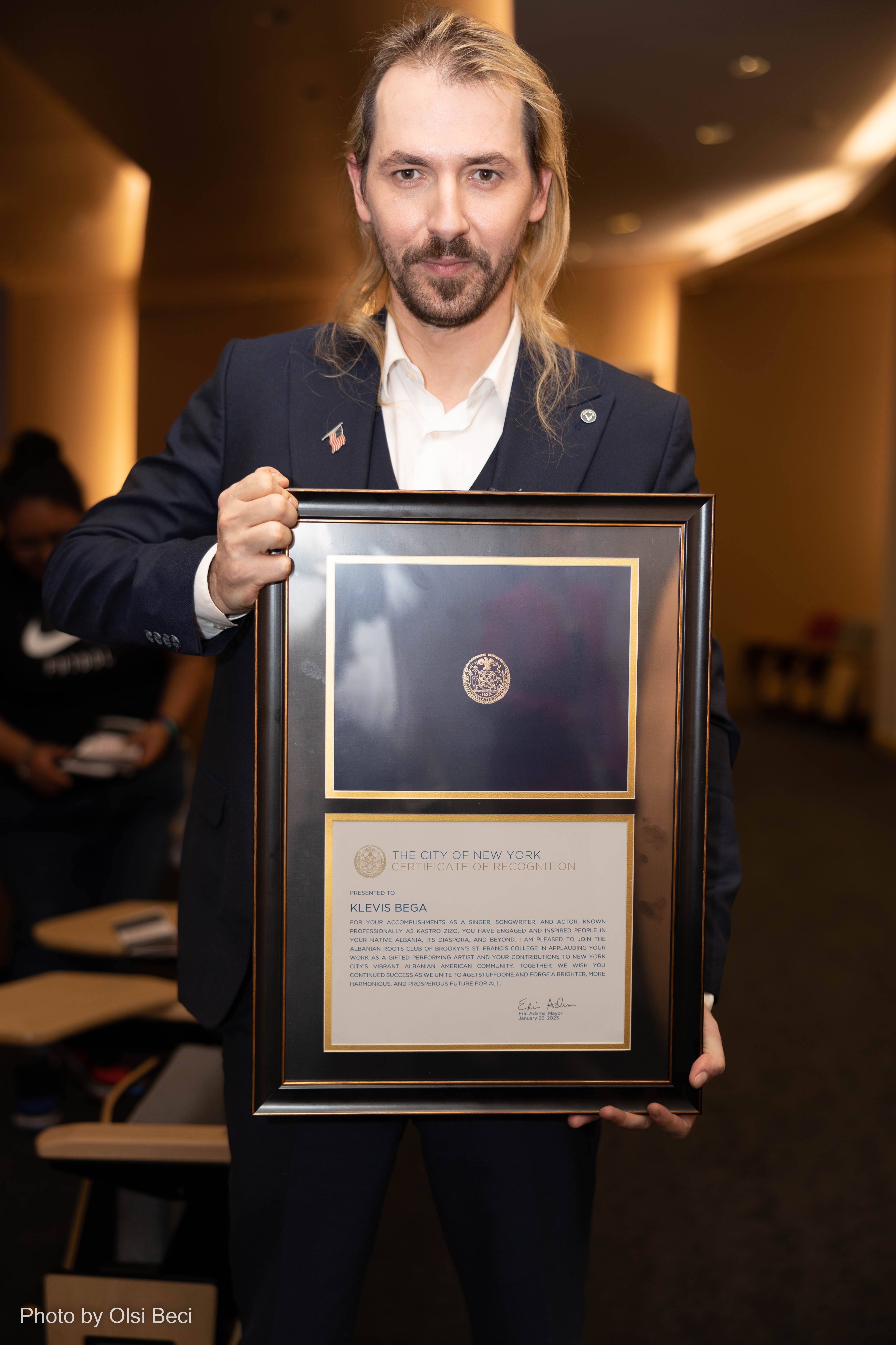 The award certificate states: “The City of New York certificate of Recognition presented to Klevis Bega for your accomplishments as a singer, songwriter, and actor known professionally as Kastro Zizo. You have engaged and inspired people in your native Albania, its diaspora, and beyond, I am pleased to join the Albanian Roots Club of Brooklyn’s St. Francis College in applauding your work as a gifted performing artist and your contributions to New York City’s vibrant Albanian American community. Together we wish you continued success as we unite to #GETSTUFDONE and forge a brighter, more harmonious, and prosperous future for all. – Eric Adams, Mayor, January 26, 2023, New York.”